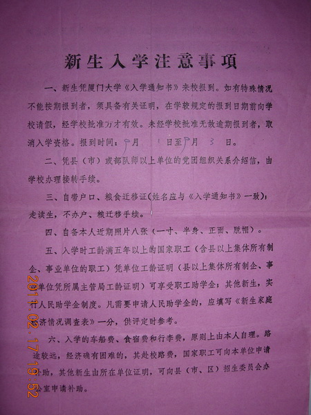 今天元宵,回家探望母亲。饭后,闲话间无意中提及当年很多东西现在都丢失了,包括我的录取通知书之类。母亲听了,连说没丢没丢我都保存着。于是就要去翻找。我说你别动说说就是,母亲回答说说没用我也不知道在哪里。走到书橱,取出一本比我年纪还大十几岁的厚书,从书页中翻出一叠纸,其中就有我找了一年多未见踪迹、31年前随高等学校录取通知书一同寄到的厦门大学团委会、学生会《致新同学的一封信》。就是这篇留有语病和错别字的信,是我们当年读到的最美妙、最撩拨人心的文字。很长的一段时间,都是我们理想的风帆和前进的号角。