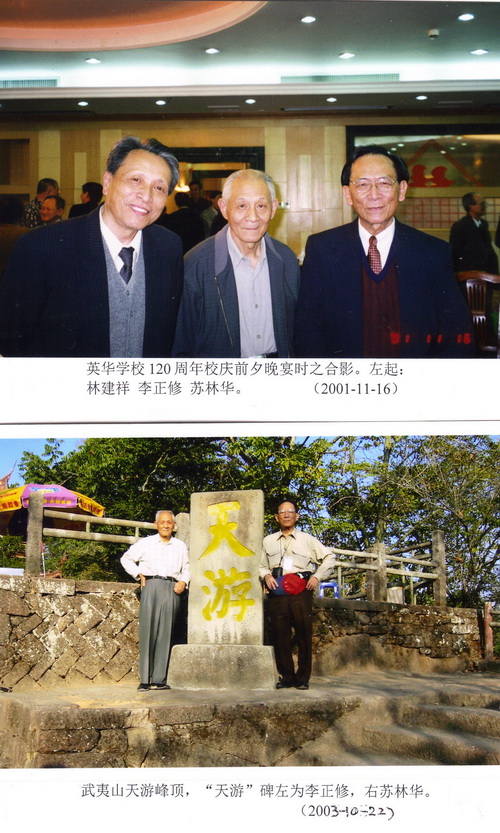 1944年夏我俩自英华高中毕业,我被校方保送入厦大机电系,往长汀就学二年,1946年夏始复员;他则考入邵武之协和大学攻读化学,但感不理想,故翌年考入厦大航空系,但因厦大校舍被政府作为日俘及日侨之收容所,故厦大之大一上课及住处移至鼓浪屿。一直到1946年暑假之后,我们两人才回到厦大校本部上课,这时他上大二上,我上大三上,但住处则同在博学楼内,他住一楼,我二楼,甚是接近,而且英华中学在厦大有校友会,格致中学也有校友会,故我俩时常有会聚之机会。1948年,我级毕业前夕,他之厦大49级(英华荟蔚班)与50级(英华成渊班)英华同学们为我们盛大欢送,在映雪楼前有合影,曾刊于拙作《苏林华文集》内,可永久纪念。