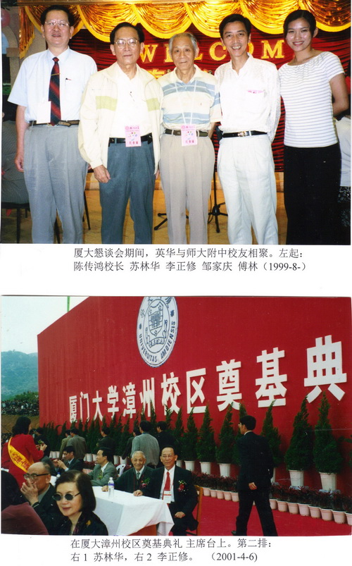 2001年11月17日,英华建校120周年之庆在福州英华职业学院内举行,院长张聪官是他在师大附中时之学生。他自南京专程来会,我则自泰国飞往,并承邀在闭幕式时为主要讲员。后两日,校友座谈会中,他有精辟之建言。