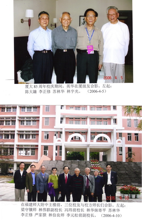 2006年4月,他引导我及奥地利严家?夫妇,接受福州师大附中之邀请返校,他与我均受聘为校友会顾问;是年10月,我在125周年校庆特刊中,被列入“优秀校友专家榜”内,似也出诸他之推荐;但自是之后,即未与他再晤面了。