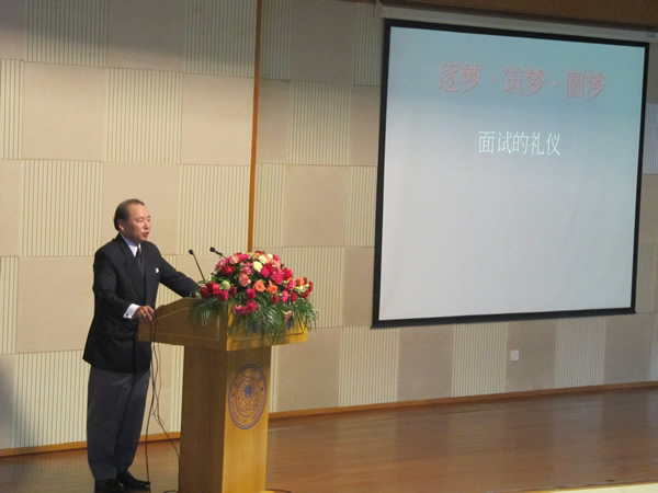 当庄正己校友以一身笔挺的西装出现时,着实震撼了在座的各位听众。自我介绍后一个鞠躬示意,引来大家一片掌声。庄学长在2007年获厦门大学历史系博士学位。现任台湾帝国工程顾问、建筑顾问、服装礼仪高级讲师;兼任合肥工业大学深圳研究院客座教授;美国科技大学建筑创意文化客座教授。用庄长的话来说,工程是他的特长,礼仪是他的兴趣,他很乐意与同学们分享他所认为在面试过程中应该注意的细节。