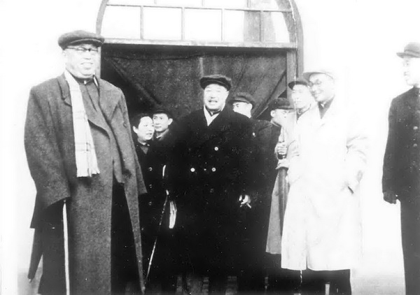 罗荣恒、贺龙两位元帅在福建省委书记、福州军区政委叶飞(右2)、副司令员皮定钧(右1)、厦大党委副书记未力工(右5)、副校长张玉麟(右3)在科学楼前合影,1961年冬。