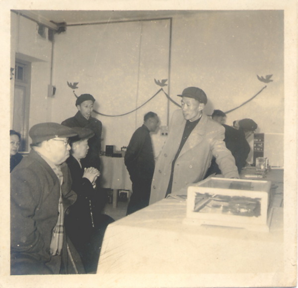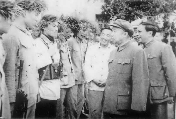 罗荣恒、贺龙两位元帅听取厦大副校长张玉麟(右1)汇报科研成果;厦门市市长李文陵(中侧面)陪同视察厦大。