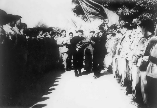 全国文艺界福建前线慰问团团长田汉(前左)在校长王亚南(前右)、校党委副书记吴立奇(后右1)的陪同下,武装民兵列队欢迎。1958年11月5日。