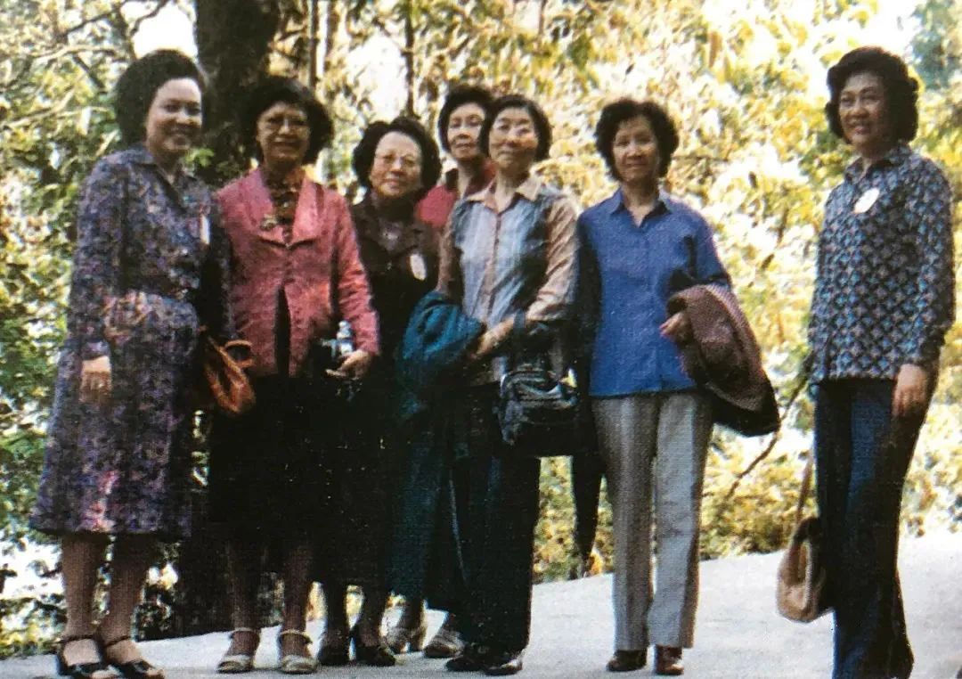 1981年4月6日,台湾校友会庆祝母校校庆60周年期间,萨夫人(右三)和昔日女生游览日月潭