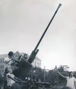 不久,民兵营增加了对付空中俯冲扫射、投弹飞机的高射机枪连。我担任其中一个班班长。这种高射机炮要比大一时在五老峰解放军炮兵阵地的三七高射炮矮小许多,三七高射炮炮弹一个17.5千克,一个个装填一个个发射;而高射机炮炮弹是五发一匣,瞄准高空敌机后连压连发,犹如地面部队的机枪。训练时,我这位班长手持红旗指向“敌机”飞来的方向,高声大喊:“发射!”方向舵手转动飞轮让机枪炮口对准敌机,装填手紧压炮弹,射击手瞄准发射,环环紧扣,个个相连。