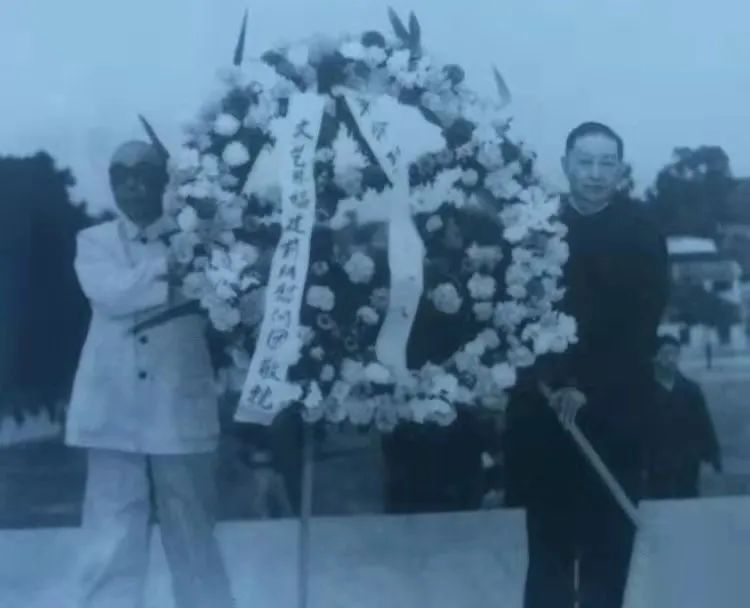 1958年,田汉(左)、梅兰芳(右)在厦门向革命烈士纪念碑献花篮