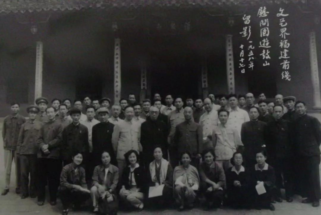 1958年10月,全国文艺界福建前线慰问团团长田汉、副团长梅兰芳等与文艺界福建前线慰问团成员游鼓山合影