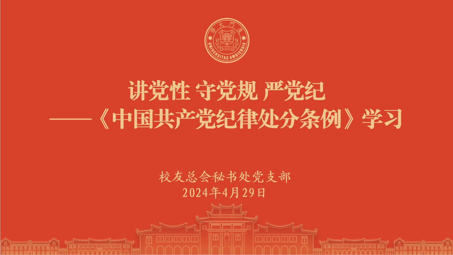 为进一步加强党的纪律建设,提高全体党员干部遵规守纪意识,4月29日下午,厦门大学校友总会秘书处党支部召开会议,专题学习新修订的《中国共产党纪律处分条例》(以下简称《条例》),扎实开展党纪学习教育,不断提升党员干部的政治素养和拒腐防变能力。