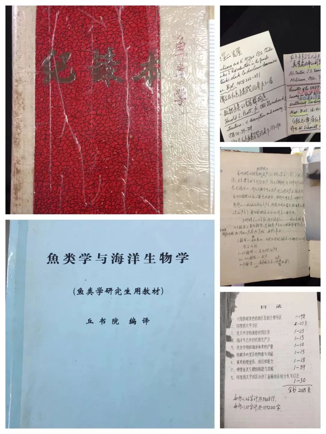 丘先生一生从事海洋鱼类学、海洋浮游生物学和海洋生态系统研究,但凡与之有关的书,他几乎都收至书阁。新中国成立前,国内有关鱼类学的书籍非常少,很多书籍只能依靠摘抄和翻译,丘先生一直保留着这些书籍的手抄版本,甚至包括插图。他在20世纪50年代编写的《鱼类学》讲义是国内海洋鱼类学的第一本教材。而他早年编译的《鱼类学与海洋生物学》手稿,则是厦门大学海洋学系1978年招收第一批研究生时用的课本。丘先生还全程参与了1984年版的《福建鱼类志》(上、下卷),该书由厦门大学、上海水产学院和厦门水产学院等单位联合编著,是当时国内第一本地方性海洋鱼类志。2006年,值厦门大学海洋学系成立六十周年之际,丘先生将其一生的学术论文集结成《丘书院文集》出版,内容涵盖浮游生物学、上层鱼类学、海洋生态学、软骨鱼类学、渔业史等领域。