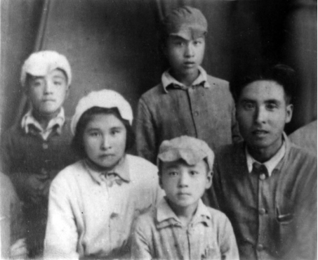 1942年赵云驶与子女赵石男(左二)、赵靖(左四)、赵民(左一)、赵进民(左三)(摄于延安)