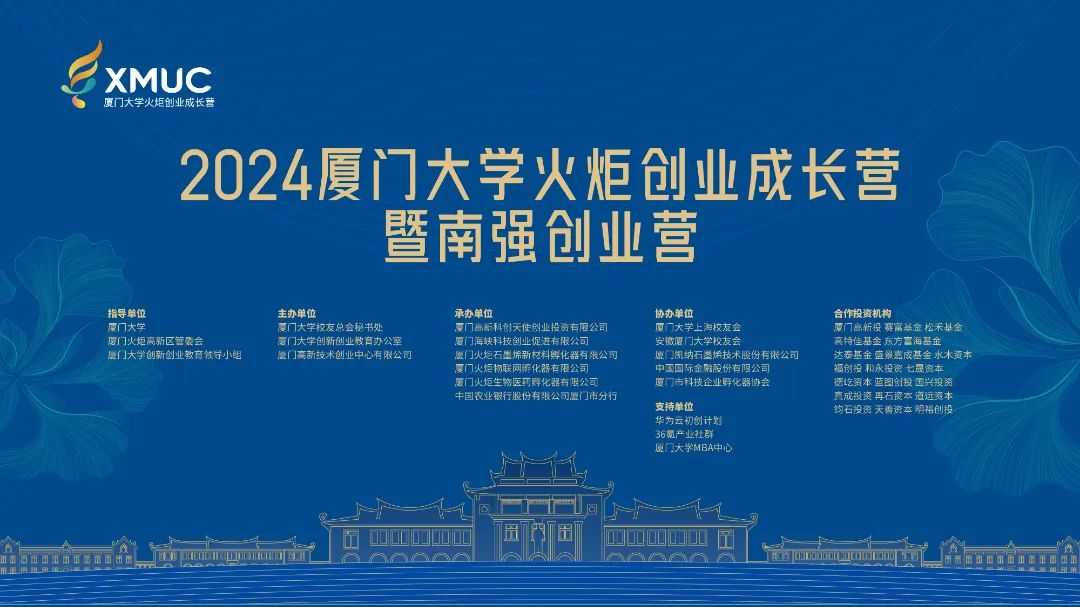 2024厦门大学火炬创业成长营暨南强创业营由厦门大学、厦门火炬高新区管委会、厦门大学创新创业教育领导小组指导,厦门大学校友总会秘书处、厦门大学创新创业教育办公室、厦门高新技术创业中心有限公司主办,厦门高新科创天使创业投资有限公司等单位承办。