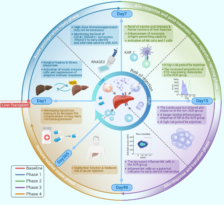 创新成果之一是,研发团队在国际上首先提出供、受体遗传因素,受体体重及肝功能是影响他克莫司代谢的最主要因素。同时深度解析了肝移植术后低免疫状态下的“四分期”免疫调控网络。