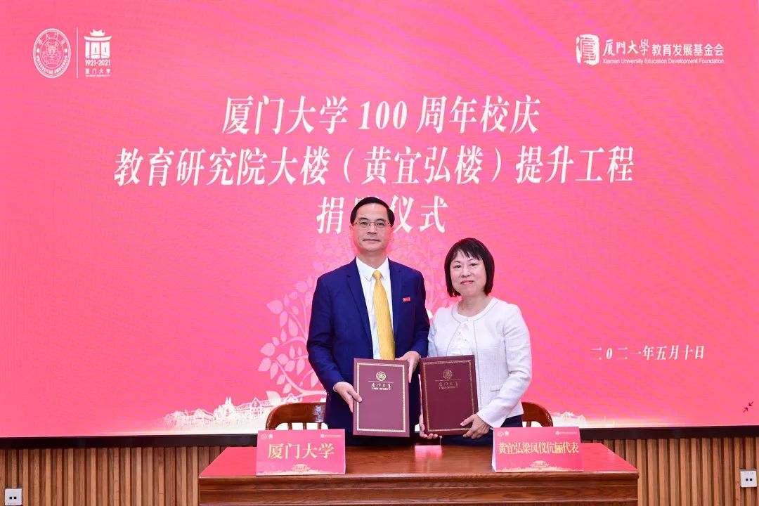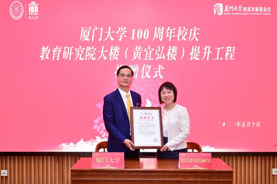 日前,香港著名财经小说作家、企业家、慈善家梁凤仪博士代先生黄宜弘博士慷慨捐赠厦门大学,襄助教育研究院大楼(黄宜弘楼)提升工程,支持学校教育事业。5月10日下午,捐赠仪式在厦门大学科学艺术中心举行。捐赠人代表、香港勤+缘慈善基金董事局办公室主任兼主席高级助理招慧霞,厦门大学副校长、教育发展基金会副理事长邱伟杰等出席捐赠仪式,仪式由教育发展基金会秘书长曾国斌主持。