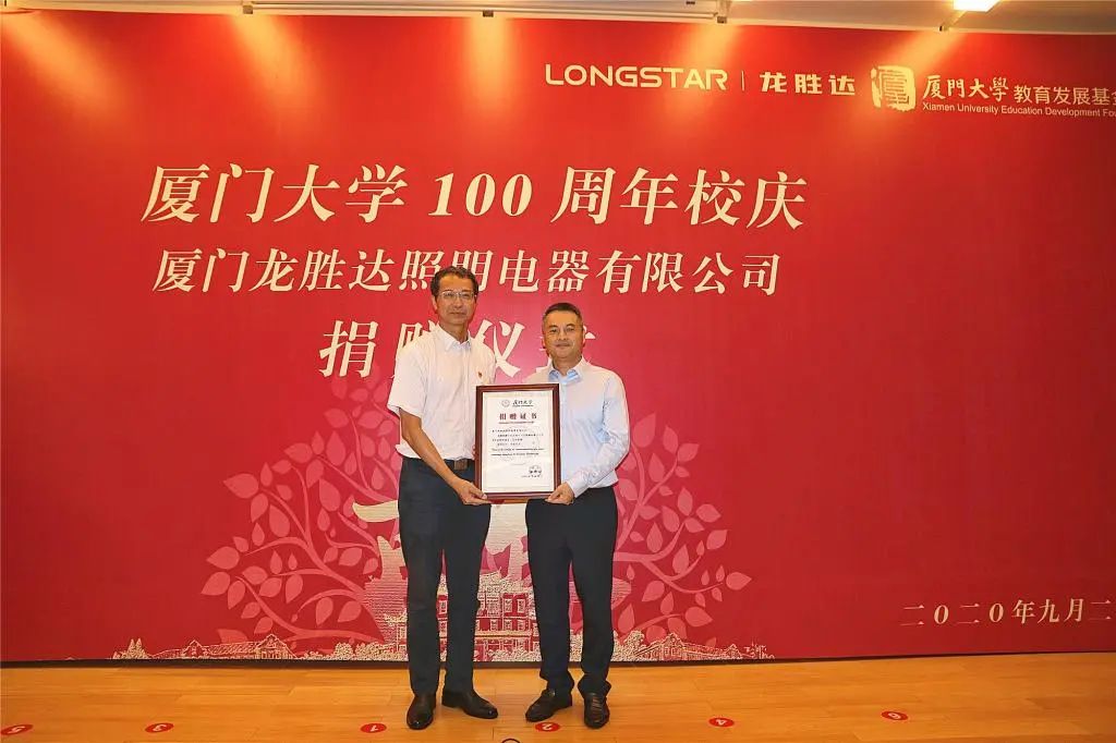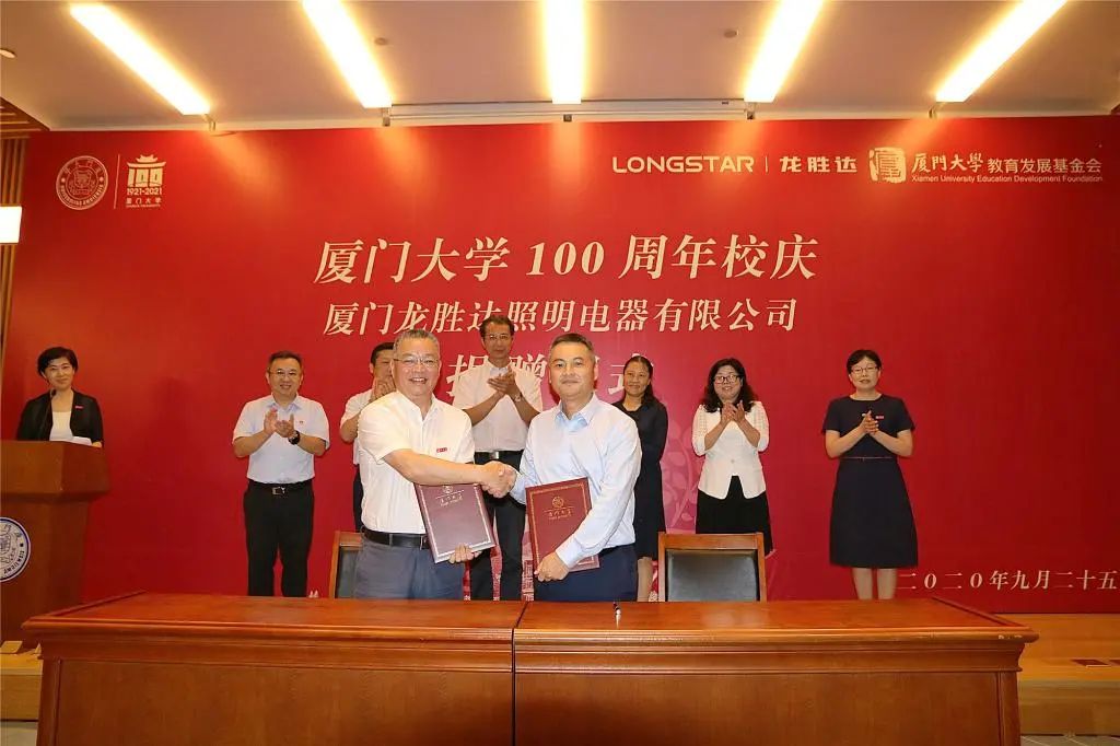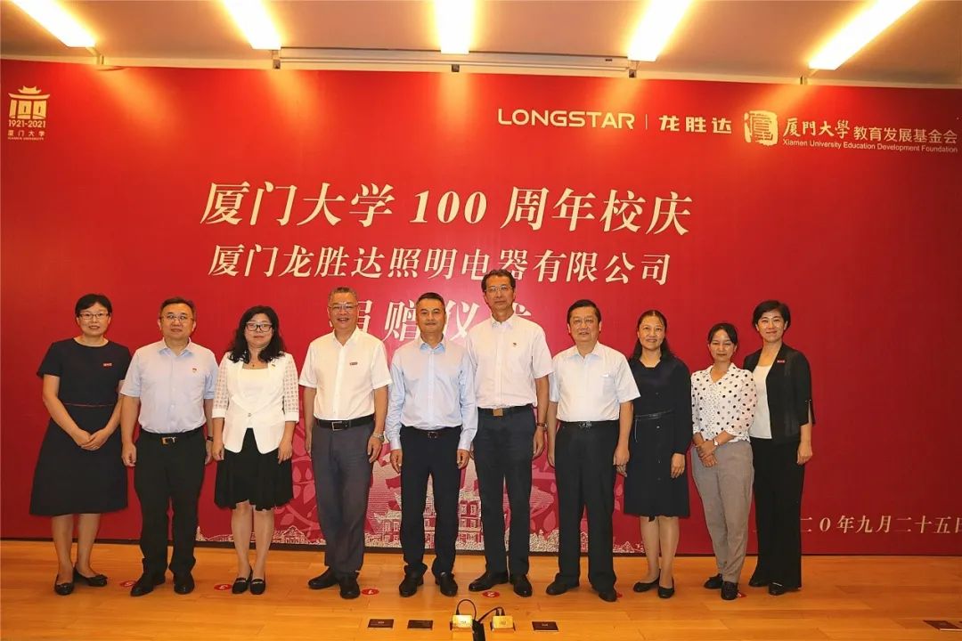 9月25日下午,厦门龙胜达照明电器有限公司捐赠厦门大学1000万元,设立“龙胜达教育基金”,献礼厦大百年华诞,支持学校教育发展。捐赠仪式在科学艺术中心4号会议室举行。厦门龙胜达照明电器有限公司董事长李希龙,厦门大学党委副书记、教育发展基金会监事会主席、校友总会副理事长赖虹凯,副校长、教育发展基金会副理事长、校友总会副理事长叶世满等出席捐赠仪式。
