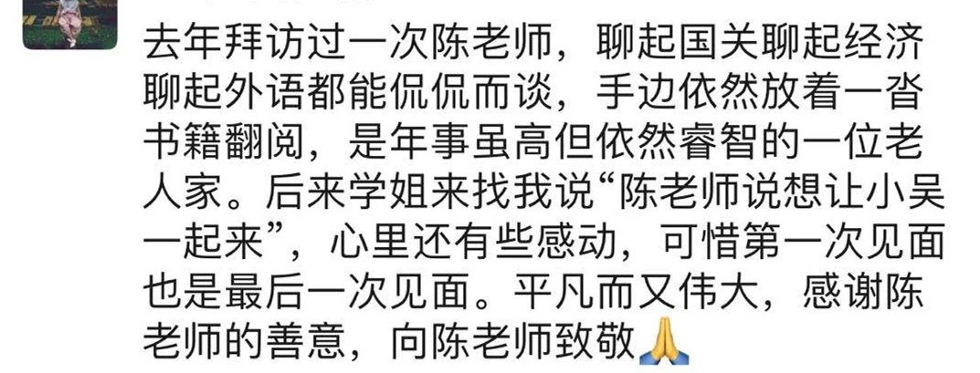 2019年10月,相依为命的妹妹因病去世,坐在轮椅上的陈大冰根本无力操持妹妹的丧礼,在老人最为无助的时候,同事兼挚友的蒋细定老师不顾自己也是年过古稀的老人,和学院领导同事及社区工作者、社工等一起帮忙操办老太太后事。