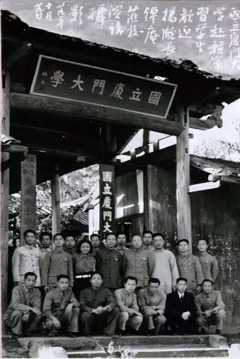 萨本栋(二排左四)在长汀厦大校门前与部分师生合影