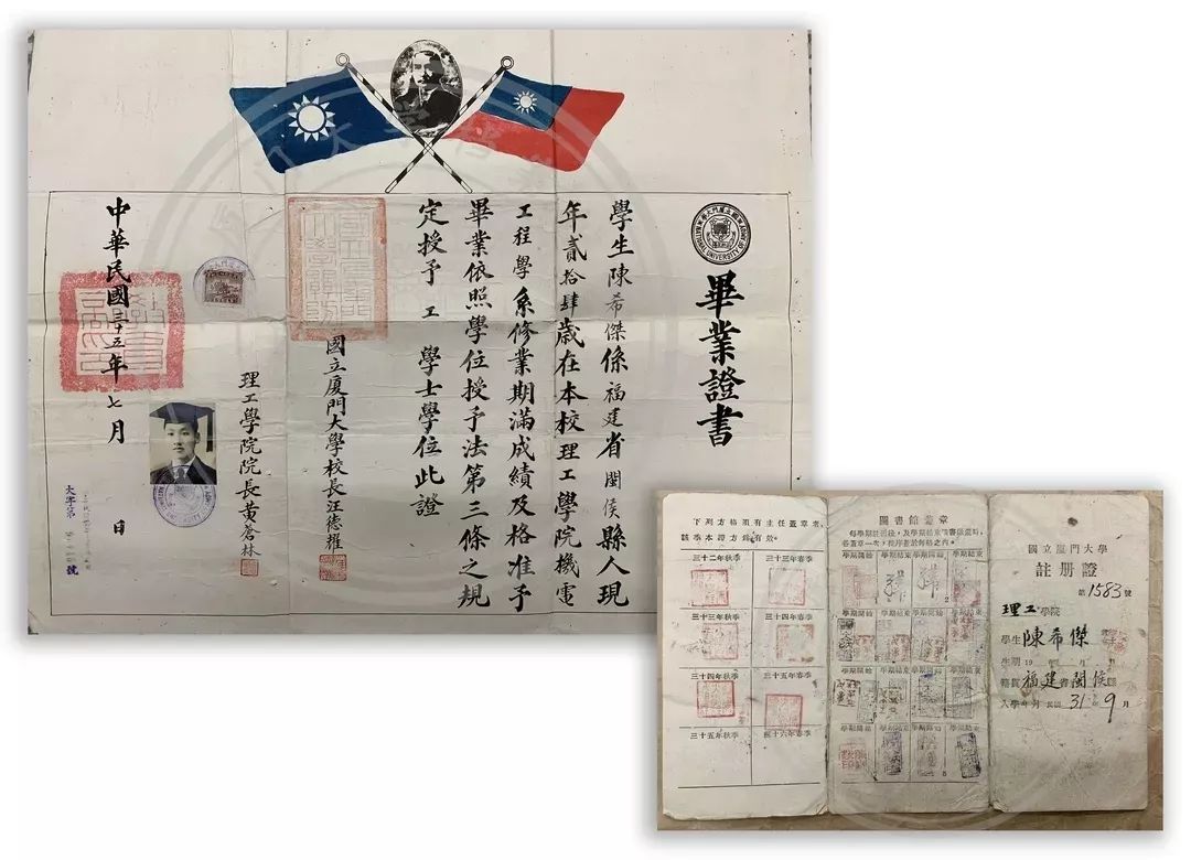 陈希杰先生向母校档案馆捐赠了他珍藏多年的厦门大学毕业证书(1946年)、国立厦门大学注册证(1942年)、临时毕业证明书、在校成绩卡、免价代金证明书等五份学籍资料及在校期间使用的计算尺一把。