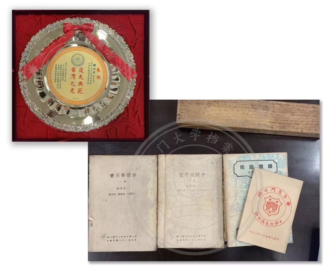 周詠棠先生曾在2013年向我馆捐赠一批历史资料,包括他个人收集的厦大老照片、校友通讯、级友聚会影像资料等等,此次他又向母校档案馆捐赠了四本由萨本栋校长主编的教材《实用微积分》(1942年版)、一册1969年印制的《国立厦门大学台湾校友通讯录》、厦大长汀时期学生使用的计算尺、厦门大学台湾校友会感谢周詠棠先生做出卓越贡献的纪念牌以及1988年厦门大学旅港校友总会制作的校训锦旗。