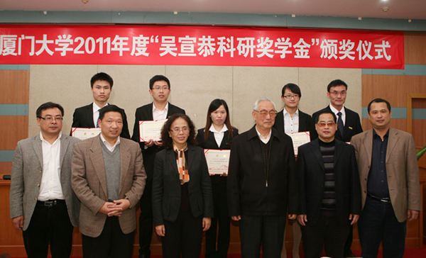 12月28日下午,2011年“吴宣恭科研奖学金”颁奖仪式在颂恩楼220会议室隆重举行。我校经济学院经济研究所吴宣恭教授和校党委副书记陈力文为获奖的5位同学颁奖。校党委党校副校长苏劲、党委宣传部部长王炳华、研究生院综合办主任李智勇,学校办公室、校党委组织部、学生处、教务处、社科处负责人、经济学院、经济研究所师生,校第二期学生马克思主义理论研修班学员和马克思主义学院学生代表参加仪式。校学生处处长林东伟主持颁奖仪式。