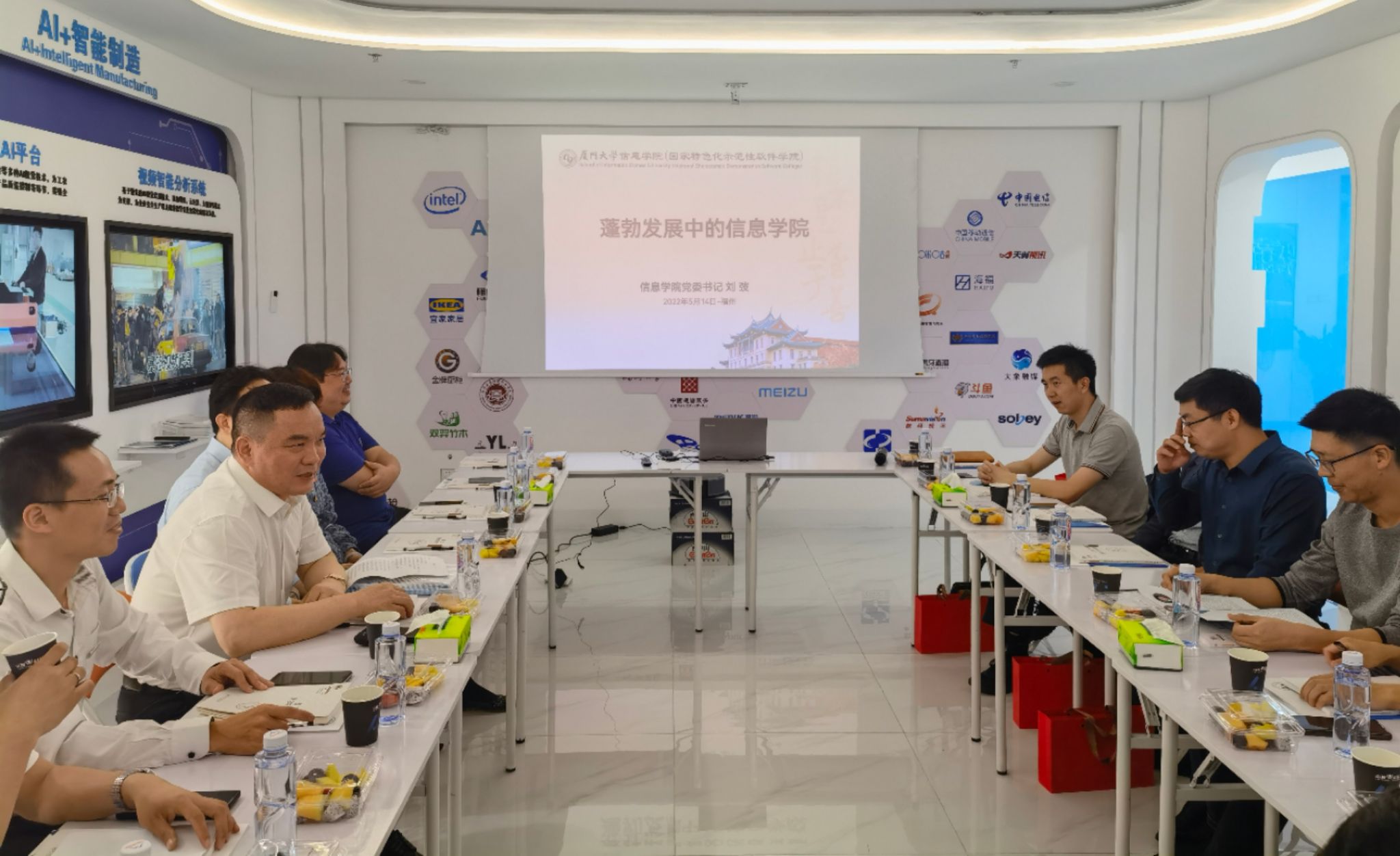14日上午,学院一行前往福建帝视信息科技有限公司,看望校友,参观公司,并开展了交流研讨。刘弢向与会人员介绍了学院的发展历程、学科建设、师资力量、人才培养、服务国家战略和区域发展等方面情况,袁飞就毕业生就业、科研组织等方面作了简要说明。