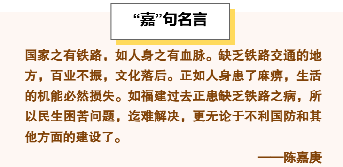 原来,三年前的全国政协第一届全国委员会第二次会议上,陈嘉庚带着福建人民的嘱托和海外侨胞的渴望,提出了在福建建设铁路的建议。