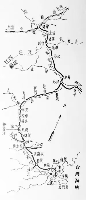 鹰厦铁路示意图“梧村塘外殷轻雷,万里飙轮倾刻来”,时代的列车在驰骋,千万个回望故乡的华侨半个世纪以来的“救乡梦”实现了,八闽大地从农业向现代工业发展的目标,乘上时代的列车飞奔起来。