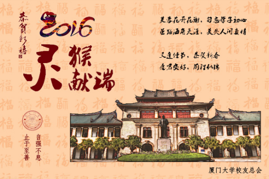 由厦门大学校友总会主办,厦门大学校友文化交流协会承办的第三届厦门大学新年校友电子贺卡设计大赛,旨在通过激发本校在校大学生的创新、创造能力,为厦大校友设计出独具一格、别出心裁的电子贺卡,从而传递对海内外厦大校友的新年祝福。本次设计大赛,得到在校学子的热烈响应积极参与,最终共收录26幅作品,其中24幅有效作品(两幅不符合贺卡模板要求)。23号上午,经评审委员会审定,评选出一等奖两名,二等奖两名,三等奖三名,创意奖一名,现对获奖作品进行公告。