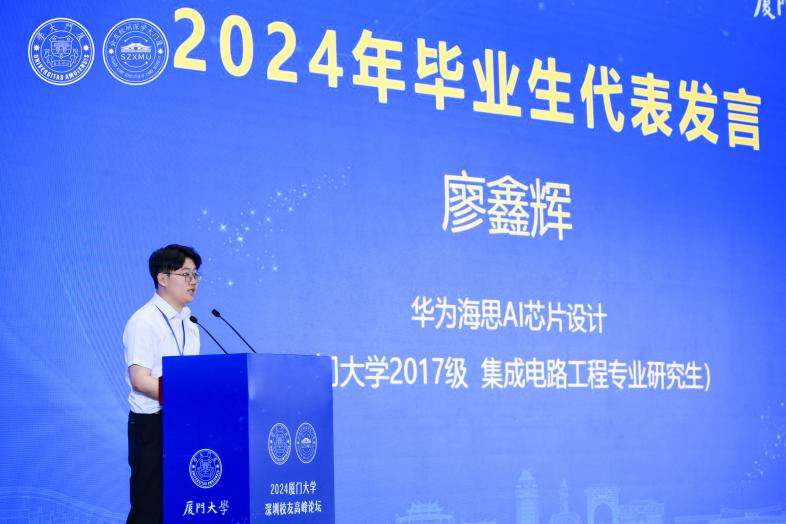 电子科学与技术学院2017级本科生2021级硕士研究生、华为海思芯片设计廖鑫辉代表新校友发言。他分享对母校的美好回忆,以及对深圳这座城市的感受和期待。虽然已离开厦大校园,但那份对知识的渴望、对生活的热爱、对梦想的追求,将伴随着他在深圳这片新天地继续绽放。