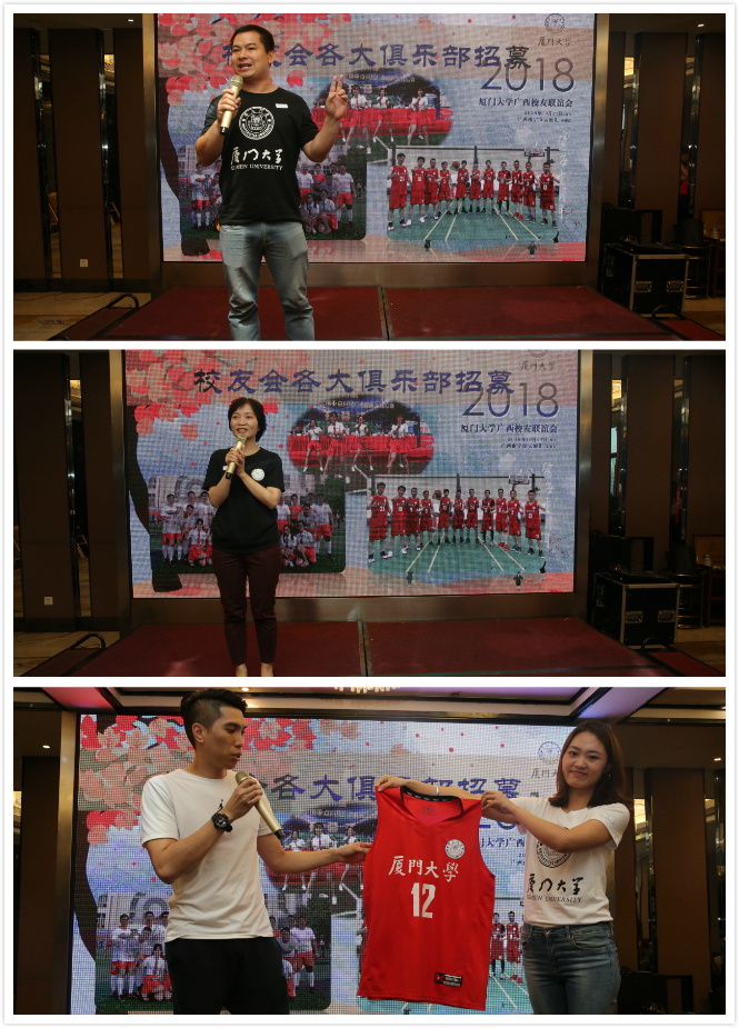 校友会组建的气排球、篮球、足球等各个俱乐部以及校友啦啦队上台进行了生动活泼的纳新宣讲。