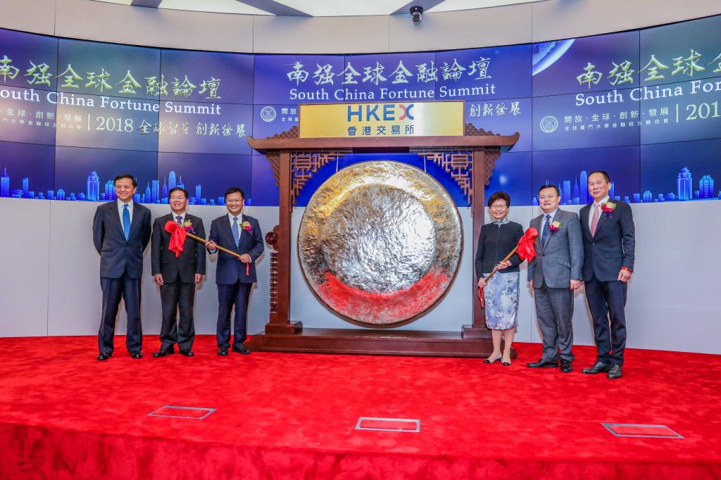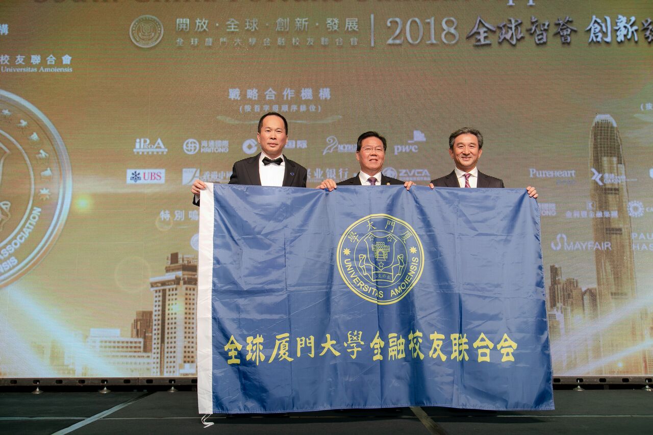 主礼仪式环节,林郑月娥、陈冬、张荣、朱崇实、李小加、陈少杰一同登台,以极富金融特色且极具象征意义的“上市鸣锣”方式,宣告全球厦门大学金融校友联合会正式成立。