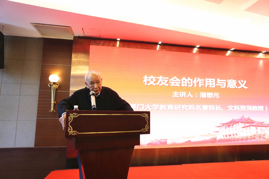 潘懋元围绕“校友会的作用与意义”作主题发言。他说,校友工作应从关注募捐的“利用校友”阶段向“关怀校友”阶段转变。校友工作是学校教育工作的延伸,校友进入社会后,学校应继续关怀、帮助毕业生的成长与发展,对校友终身负责。他表示,在这之后,校友工作将进入“反馈阶段”,校友会应广泛征求校友对母校办学的意见,征求校友对老师的教学意见,鼓励校友参与评价母校的育人工作体系。潘懋元指出,这并非最终阶段,校友工作的第四阶段为“研究阶段”。社会对一所大学的评价,最终是以这所大学所培养的毕业生的全面质量和对社会所作的贡献作为标尺。校友会应对工作五年以上的校友进行调研,研究我们培养的人才是否符合社会的需求,考察校友在校所学与工作所用是否相契合,把校友作为学校办学成果的检验,将调研成果作为促进母校立德树人、提高教学质量的依据。