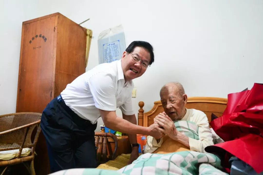 庆典当天,朱崇实一行一下高铁立即赶赴黄岩福利院看望我校百岁校友毛坤宏,送上深切的关怀和祝福,祝毛坤宏老校友健康长寿。
