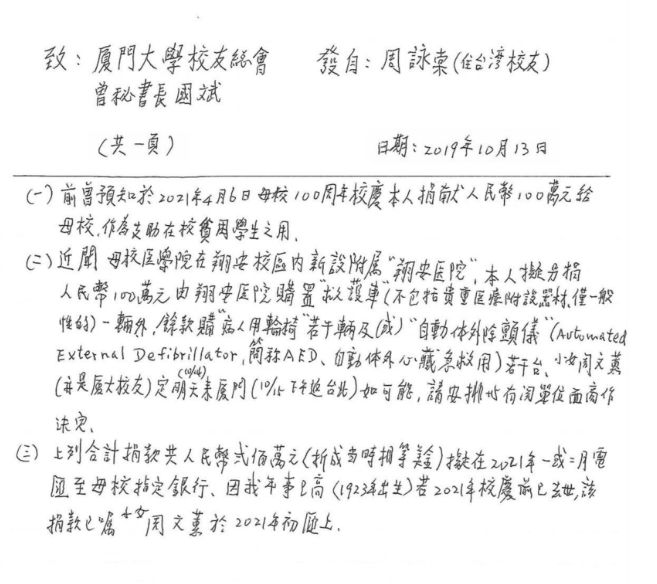 “……上列合计捐款贰佰万元,拟在2021年一或二月电汇至母校指定银行。因我年事已高(1923年出生),若2021年校庆前已去世,该捐款已嘱小女周文蕙于2021年初汇上。”