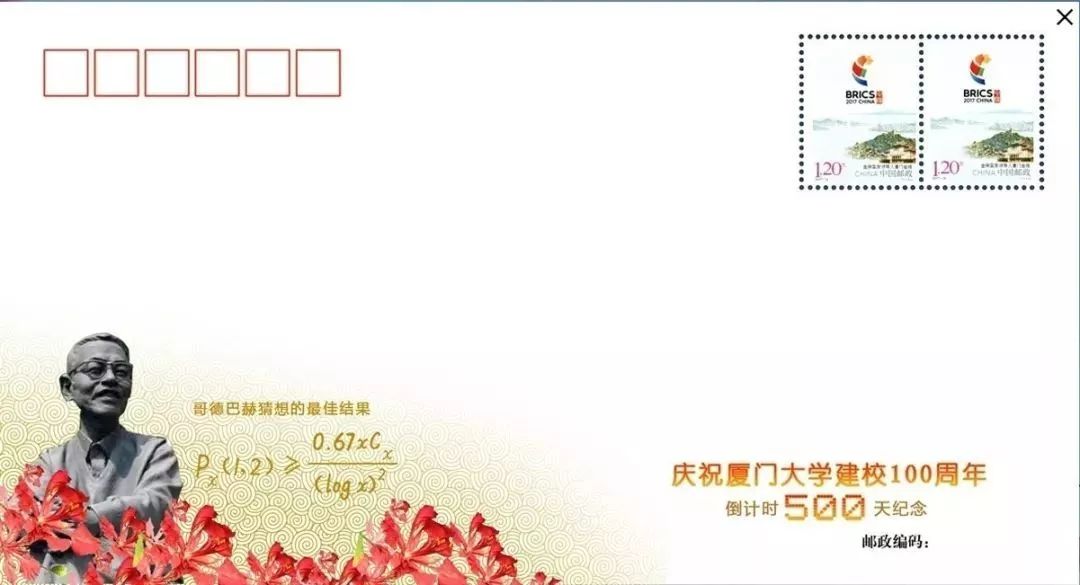 随后,举行厦门大学100周年校庆倒计时500天纪念封首发仪式。赖虹凯、叶世满为纪念封揭幕。百年校庆系列纪念封以学校“四种精神”代表人物为设计元素,将在百年校庆到来之前陆续推出5个纪念封。倒计时500天推出的纪念封以陈景润先生为杰出代表的厦门大学科学精神为主要元素,正面印有陈景润先生的铜像及其哥德巴赫猜想的公式,右上角贴有建南大会堂标志的金砖会晤邮票,背面印有陈景润先生的生平简介及厦门大学马来西亚分校剪影。