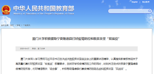 厦门大学深入学习贯彻习近平总书记在决战决胜脱贫攻坚座谈会上的重要讲话精神,认真落实教育部党组关于高质量打赢打好脱贫攻坚“收官战”部署要求,在抓好学校疫情防控工作的同时,时刻关注定点扶贫县宁夏隆德县疫情防控形势,打好精准帮扶“组合拳”,积极帮助隆德县打赢疫情防控阻击战和脱贫攻坚“双战役”。
