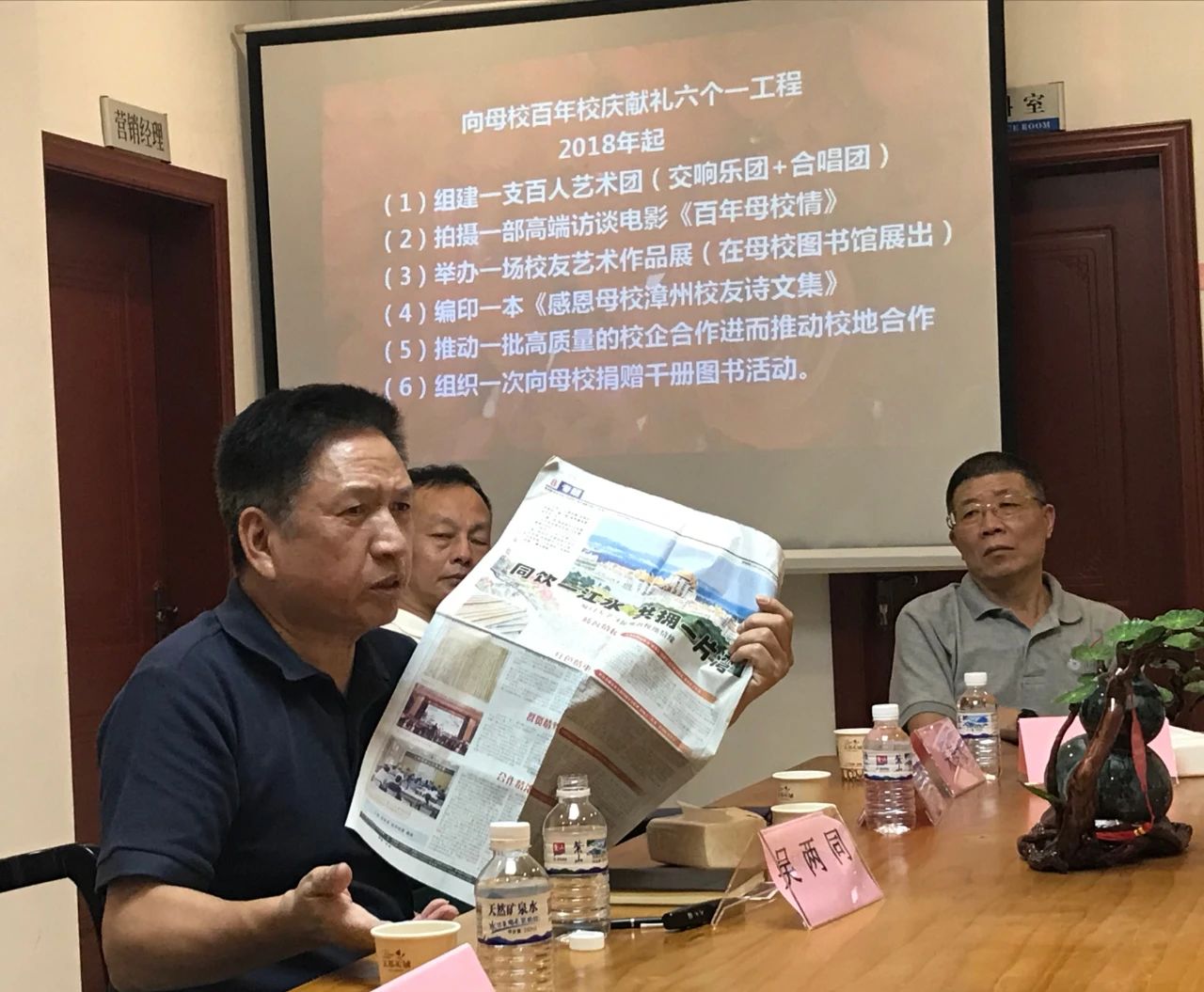 郭少泽副会长在会上着重汇报了“六个一”献礼项目之一《感恩母校漳州校友诗文集》征稿情况。校友们踊跃投稿,写出了一批高质量的文章。汪毅夫学长怀念白明新校友、周天眷学长口述陈嘉庚校主到学生宿舍做客、陈永清学长回忆“金门炮战”期间田汉、梅兰芳率团慰问厦大师生、郑海涛学长记述厦大男排漳州队员等文稿发表后,引起了校友们的关注和转发。