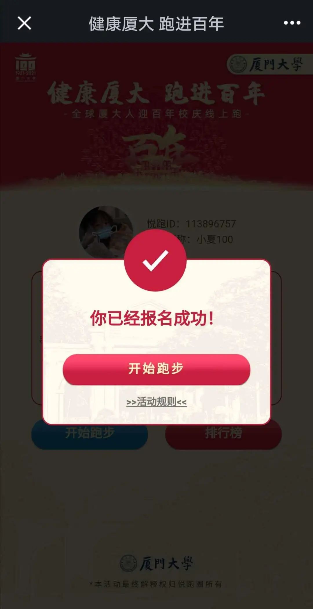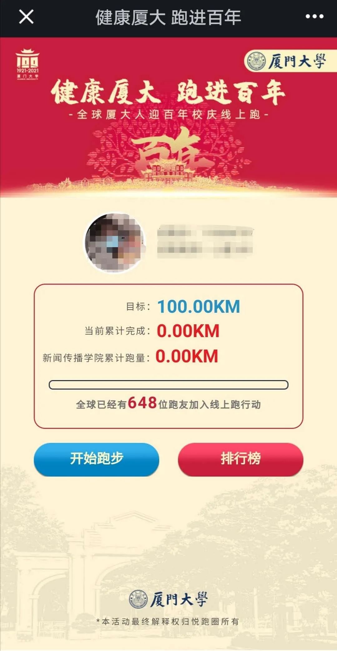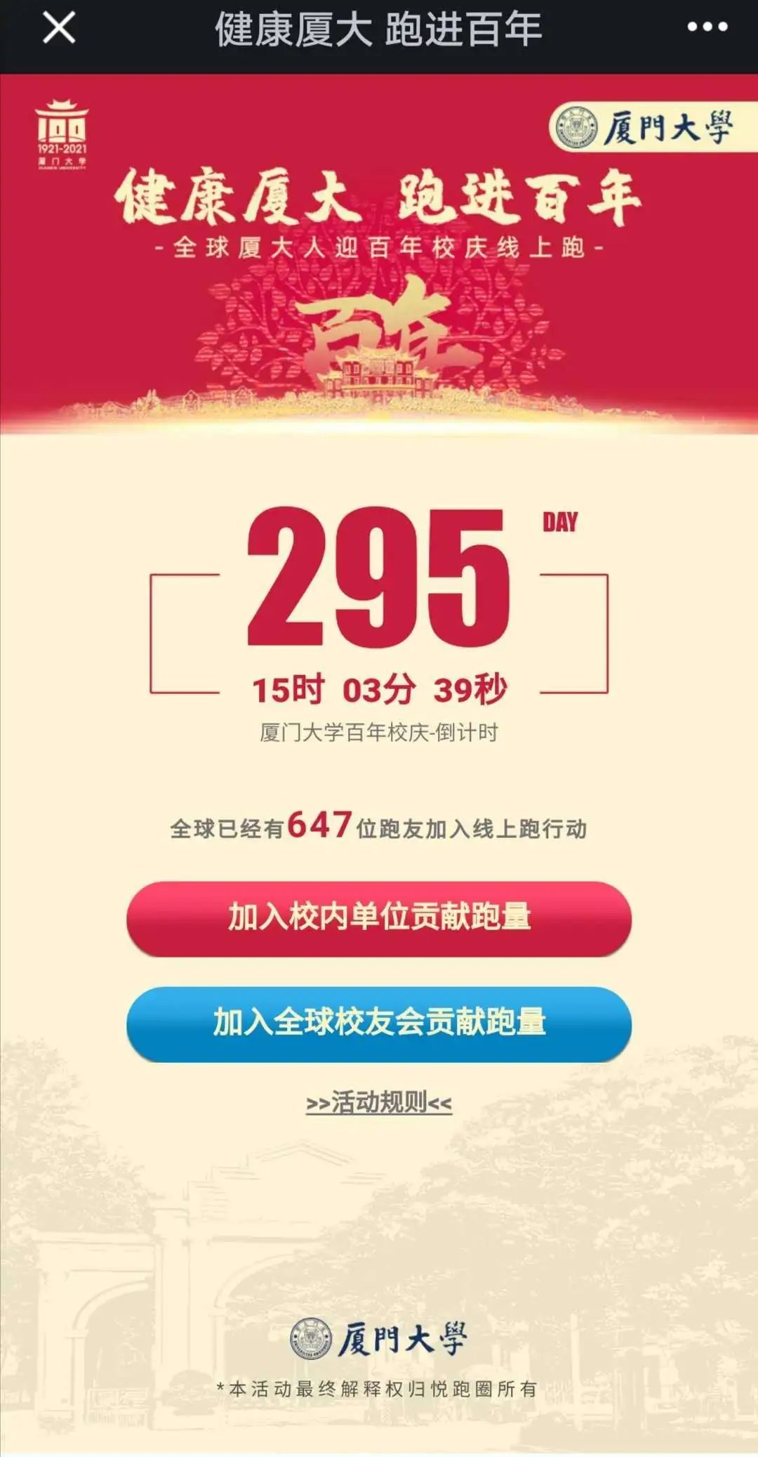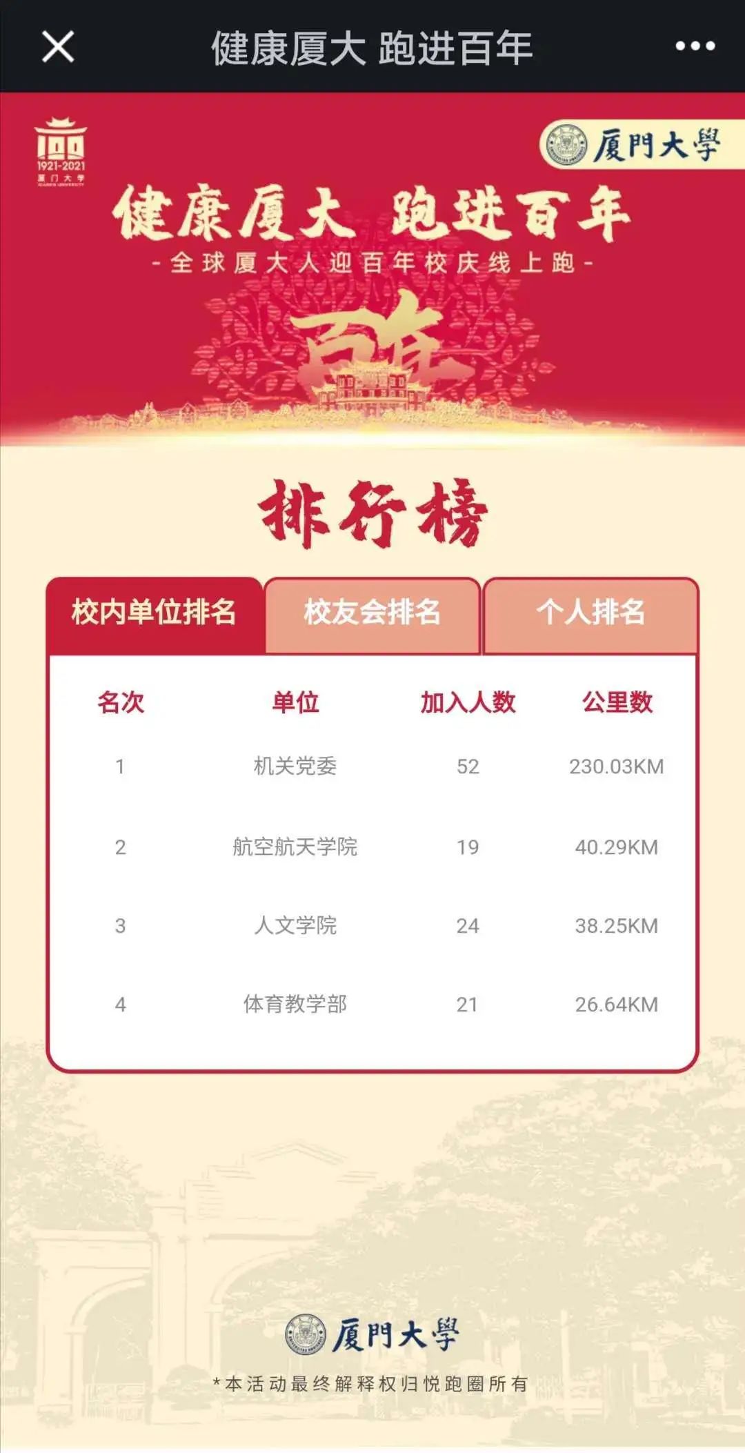 “悦跑圈”App--“广场”--“活动”--“健康厦大,跑进百年”活动