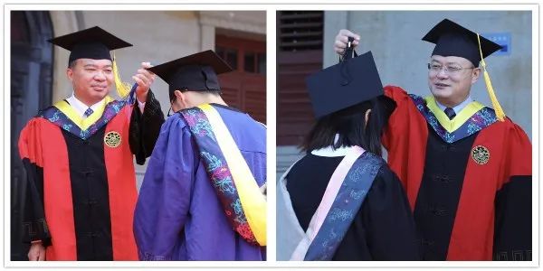 校领导宣读学位授予决定。会堂内的师生移步到建南大会堂正门外参加学位授予仪式,在激昂的校歌声中,毕业生们依次上台,领导和嘉宾为他们颁发学位并援正流苏。接受学位证书的毕业生们,从大会堂西侧设置的“毕业之门”走出,预示着步入人生新阶段。