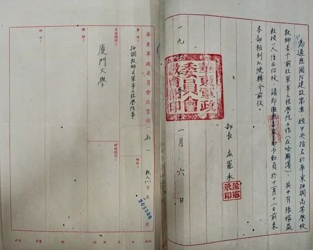 1952年,抽调厦门大学教师赴哈尔滨军事工程学院的函件