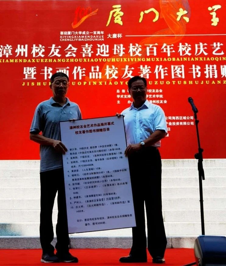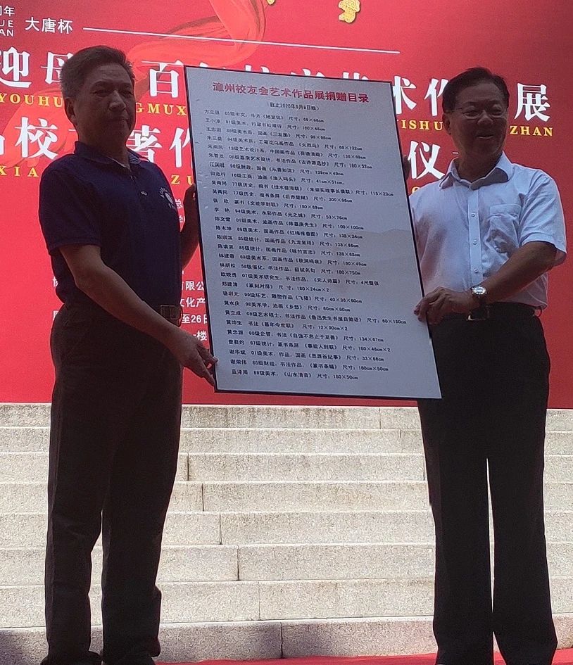 在开幕式上,漳州校友会副会长郭少泽代表6位校友捐赠著作与图书,执行会长兼秘书长吴两同代表30位校友与特邀作者捐赠书画作品与雕塑。朱崇实理事长代表学校接受了漳州校友会的捐赠。朱崇实理事长、赖虹凯副书记、叶世满副校长为捐赠校友与特邀嘉宾颁发捐赠证书并一一致谢,场面感人。
