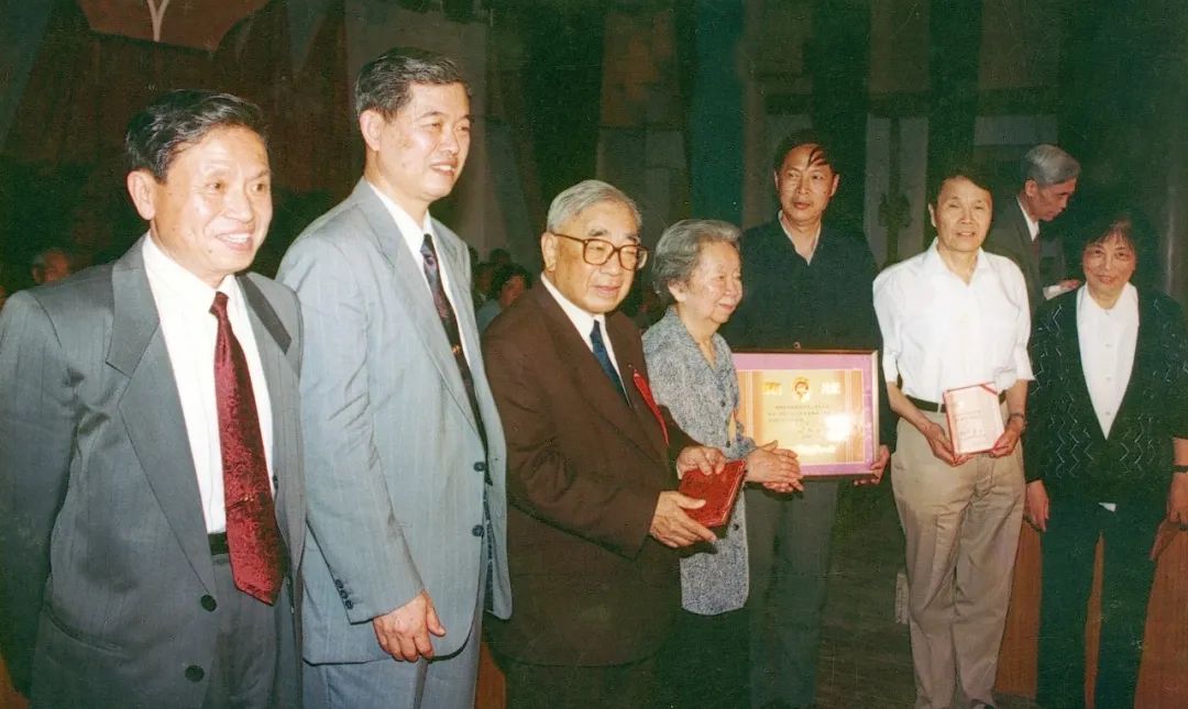 1994年4月6日,厦门大学建校73周年庆祝大会上,卢嘉锡(左三)、谢希德(左四)和校领导向“南强奖”获得者颁奖