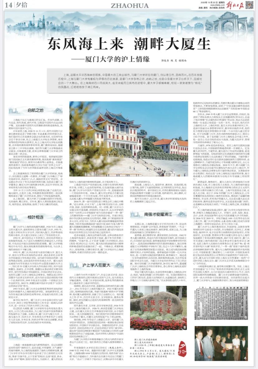 厦门大学与上海的高校颇有渊源。1924年在上海成立的大夏大学,最初的师生主要来自厦门大学。1951年,大夏大学和光华大学合并,同时调进复旦、同济等高校部分系科,在大夏大学原址上成立了华东师范大学。