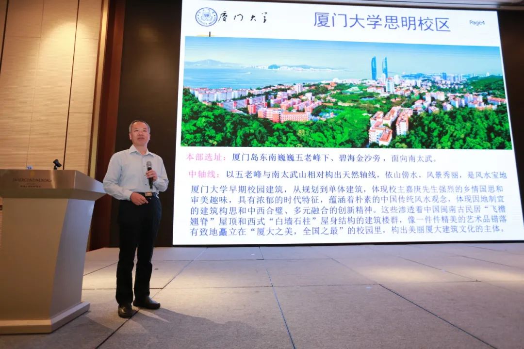 厦门大学校长助理张建霖教授向大会致辞,并介绍厦门大学现在各个校区规划,为大家传达“以人为本”“传统和现代的和谐统一”“将自然景观、绿色生态等和建筑创作相结合”“留用可发展用地计划”的校区规划理念,带领大家回忆在校时光,感受现在母校发展,欢迎各位校友在母校百年华诞之际回厦团聚。