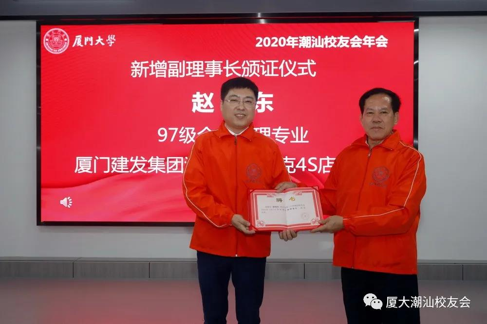 会议期间还举行了增补副理事长的颁证仪式,增补97级企业管理专业赵晓东为厦门大学潮汕校友会第八届理事会副理事长。