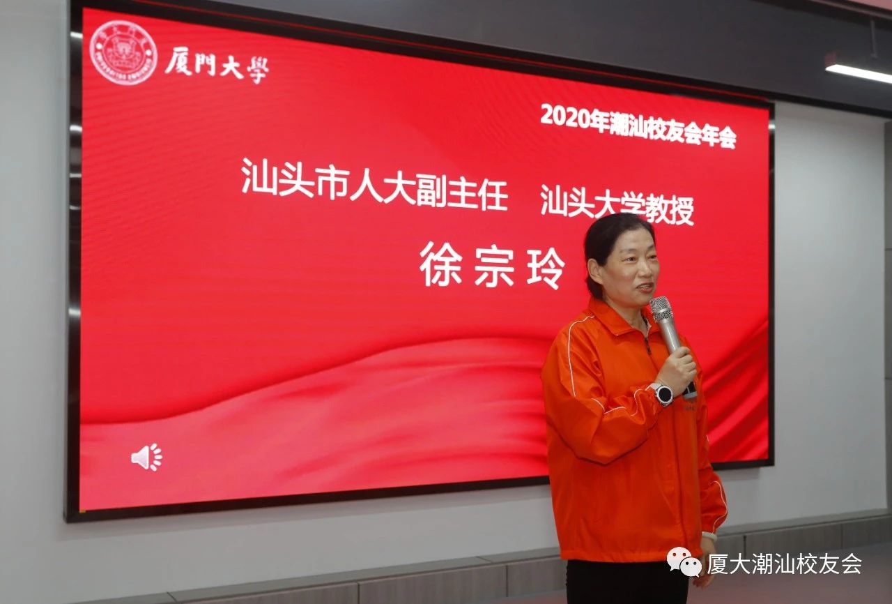 徐宗玲在讲话中回顾了大学生涯以及每年一聚的班级聚会,真正感受到了母校的情谊是一生一世的感情,厦门大学改变了很多人的命运,教育是提升自我、改变命运的必经之路,不论走到哪里,都以厦门大学为荣为傲。她表示,校友是最没有代沟的群体,在离开学校之后,校友情、师生情都变得更加珍贵,母校是所有校友和师生紧密联系的纽带。潮汕校友会理事长、秘书长在集聚潮汕地区的校友方面做了大量的工作,希望越办越好,人气越来越旺。