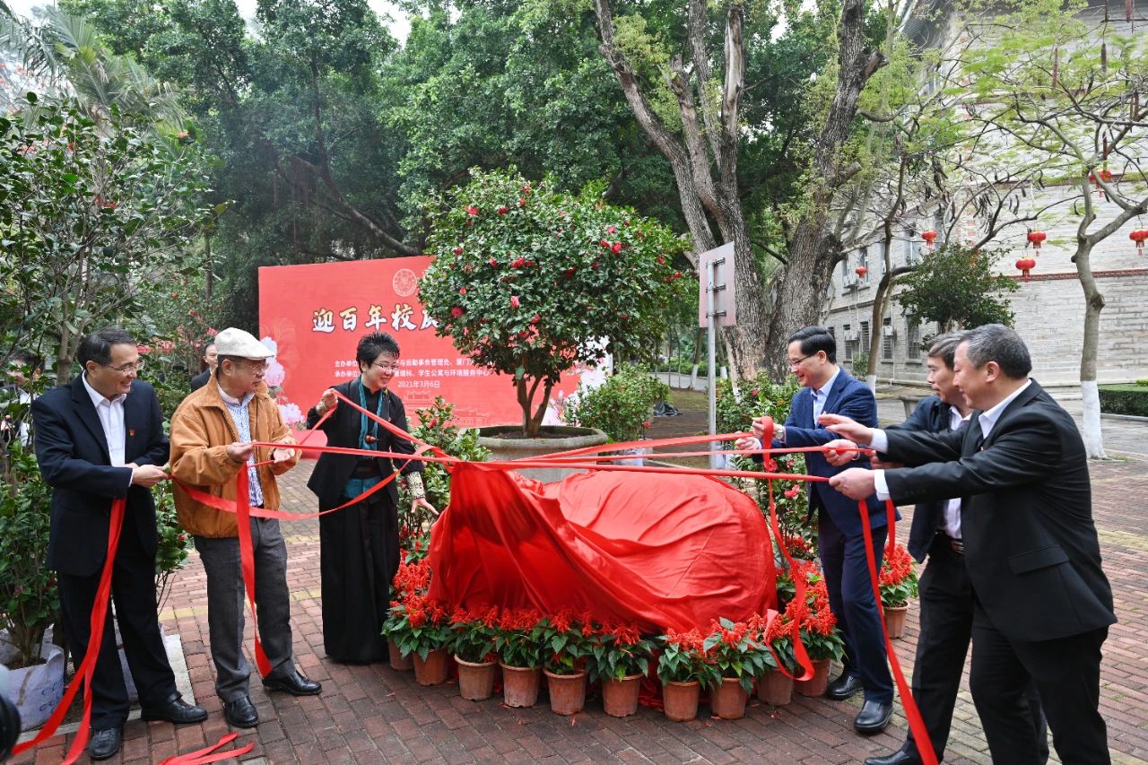 为迎接厦门大学建校100周年,3月6日,学校在勤业茶花园举行茶花园纪念石揭幕暨茶花展活动。副校长邱伟杰,化学系1984级校友阎华英与其先生许建设出席活动,后勤集团副总经理刘君彬主持活动仪式。