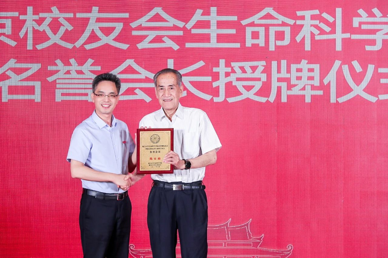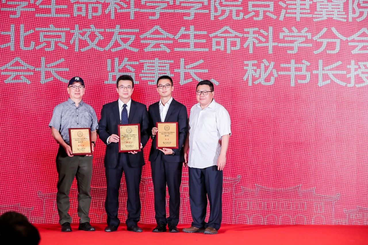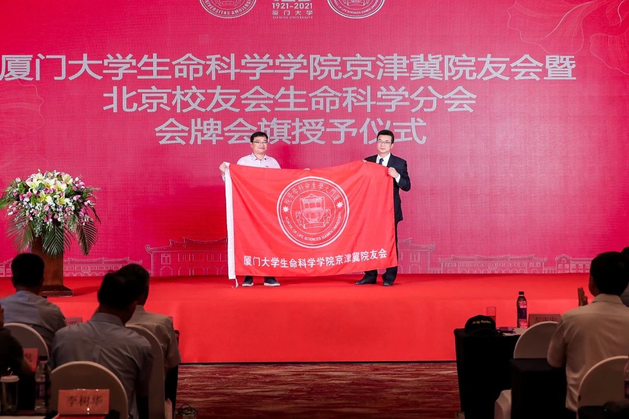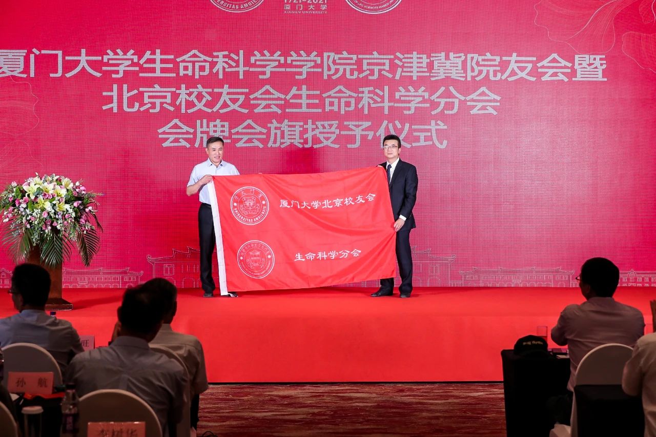 周五一、左正宏分别授予北京校友会生命科学分会会旗及生命科学学院京津冀院友会会旗。