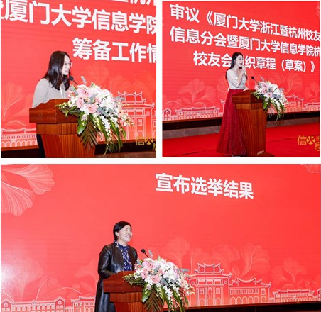 成立大会在激昂的校歌声中拉开帷幕。会上,信息学院2007级计算机系校友丁欣代表信息学院杭州校友会筹备组向大会作工作汇报,详细介绍了筹备组的前期筹备工作,同时对母校母院、厦门大学浙江暨杭州校友会及兄弟学院校友会和北京、深圳、上海、温州校友会信息分会的支持表示感谢,向为成立大会付出辛劳与智慧的热心校友们以及为大会提供物资赞助的校友致以诚挚感谢!
