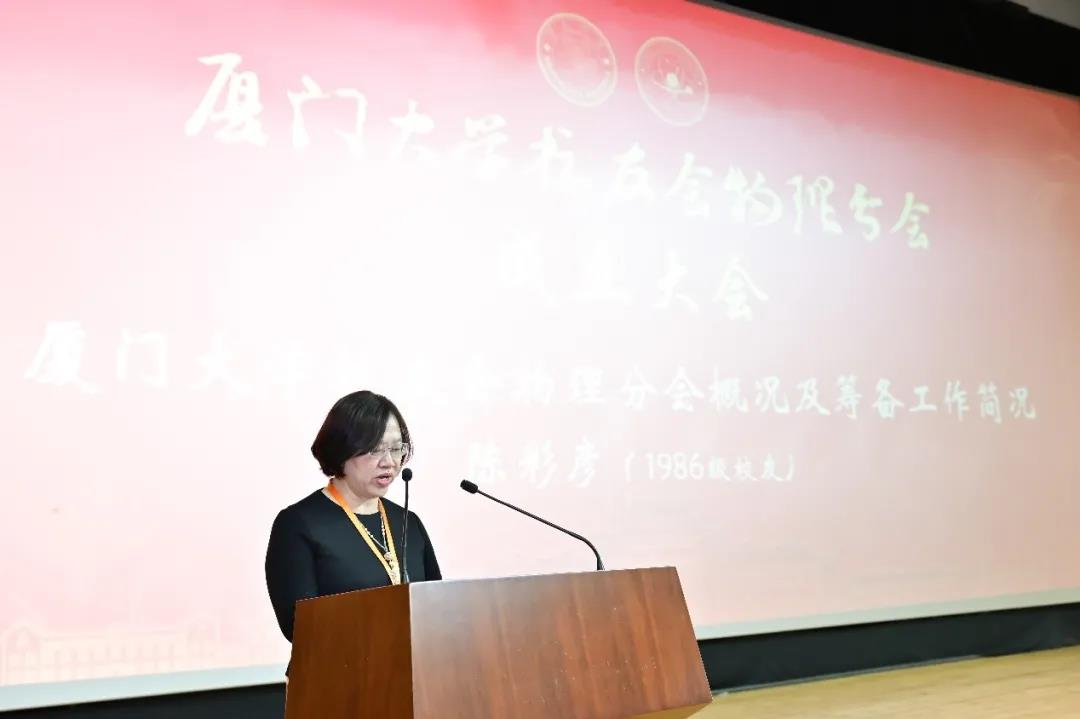 1986级物理学系校友陈彩彦代表筹备组向大会作报告,详细介绍了厦门大学校友会物理分会以“凝聚校友力量,助力物理学科的双一流发展”为第一要务所进行的前期筹备工作,同时向为物理分会成立付出辛劳与智慧、积极捐赠的校友们致以诚挚的感谢。